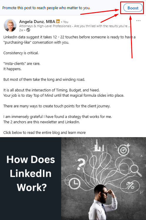 Boosting does NOT WORK WELL when you are merely doing personal life updates, “Happy Monday” posts, team photos, generic motivational posts, self-promotion, or hardcore sales posts.